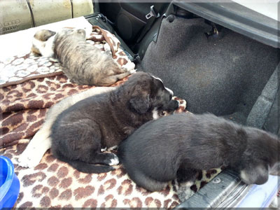130 Euro später ziehen wir mit zwei Welpen und zwei Impfpässen geistig verwirrt aber im Herzen ganz klar in Richtung Auto.
