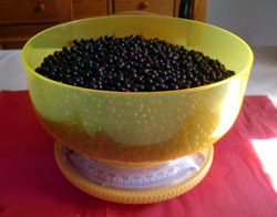 Gerade so 1kg Beeren... und eine Menge Fitzelarbeit, aber der Saft daraus ist jede Minute wert, zumindest für die Gesundheit. Besonders wohlschmeckend finde ich ihn nämlich nicht. Man genießt am besten ein Schnapsgläschen voll jeden Morgen - das lässt sich machen.Holunderbeerensaft enthält: