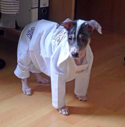 Heute haben wir die ersten Anproben veranstaltet, nach einem kleinen Einkauf bei K....IK hatten wir für nicht ganz 15 Euro einen schicken Zweiteiler und einen Langarm-Body für die Nacht. Das Hundekind schläft zwar UNTER der Bettdecke und wärmflaschenähnlich an mir dran, aber ... na ja... wenn es sich vielleicht ausversehen aufdeckt.... ;-)))))