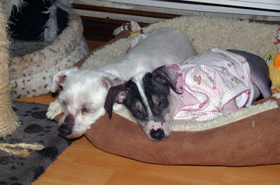 Hanni kam mit Nanni zusammen in Pflege zu uns, und weil dies gar nicht beabsichtigt war, sondern ein Krankheitsfall der eigentlichen Pflegestelle, haben wir schnell umorganisiert und Hanni am darauffolgenden Tag ihrer Ankunft noch in eine (eigene) Pflegefamilie gebracht. Dort fraß sie nicht, trank nicht und bewegte sich kaum. Lethargisch lag sie im Bettchen und wollte ... sterben? warten? hoffen?... Die Pflegemama rief mich nach Tag 2 an und sagte, sie müsse wohl zum Tierarzt mit ihr. Nach ihrer "Zustandsbeschreibung" von Hanni war mir klar: diese Hündin muss nicht zum Tierarsch, sondern zurück ;-)