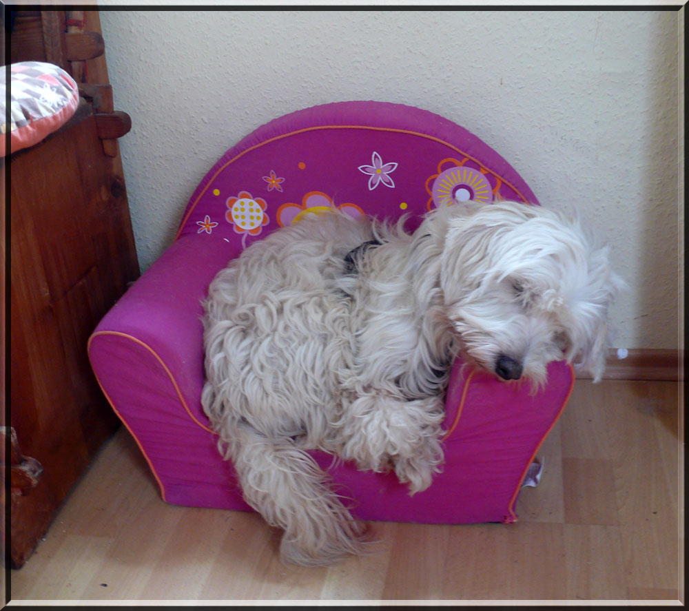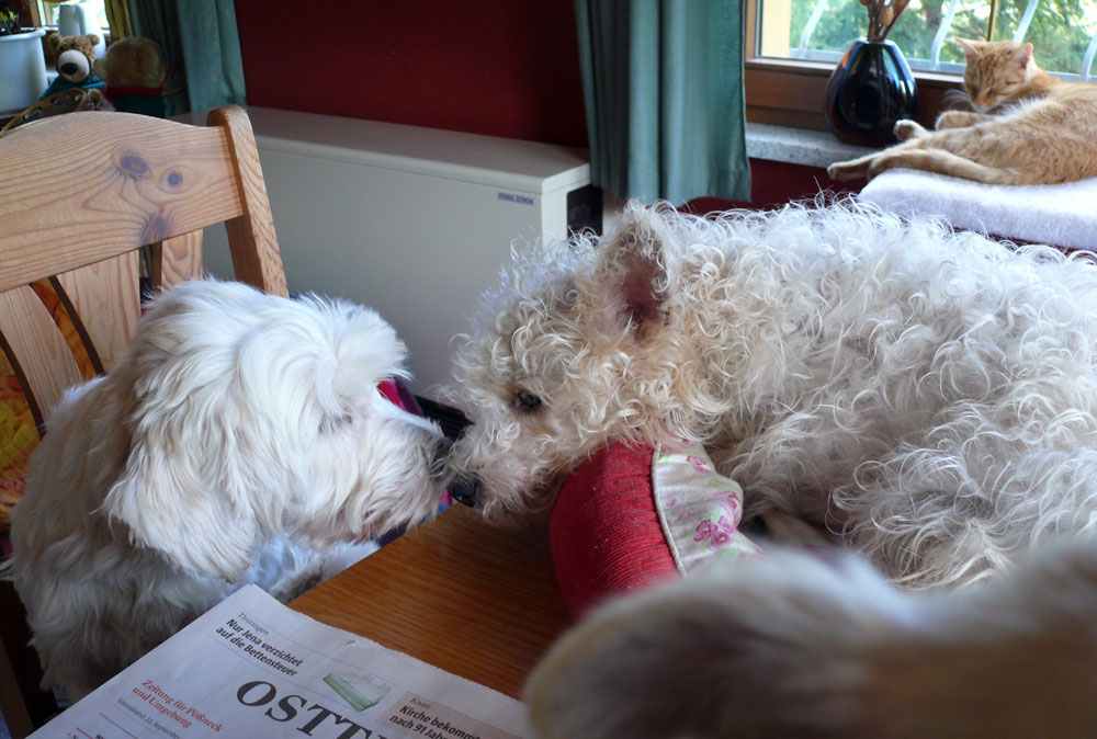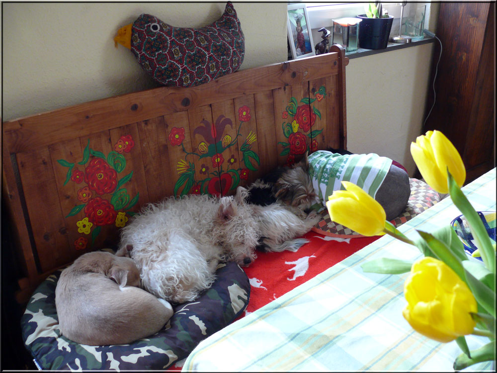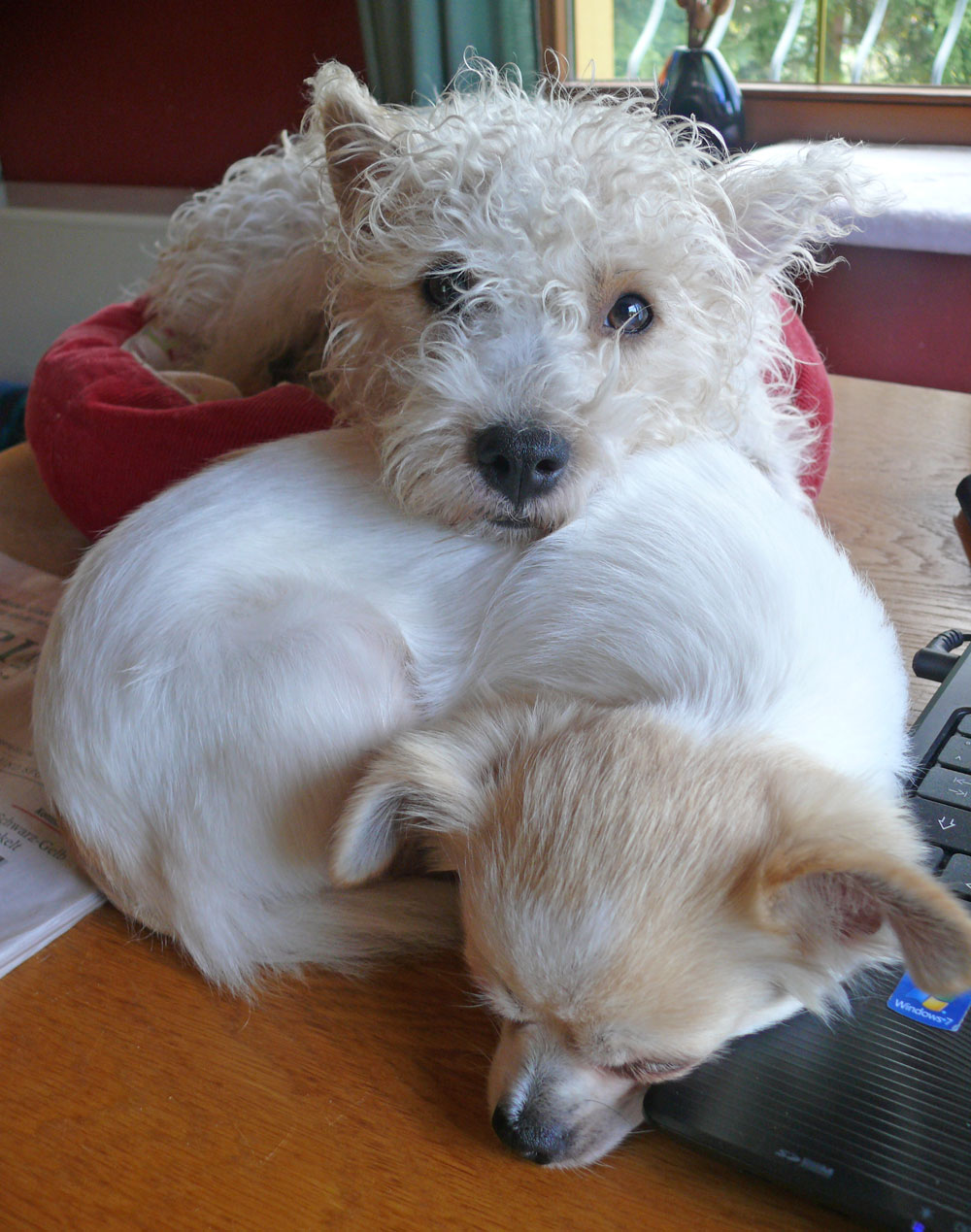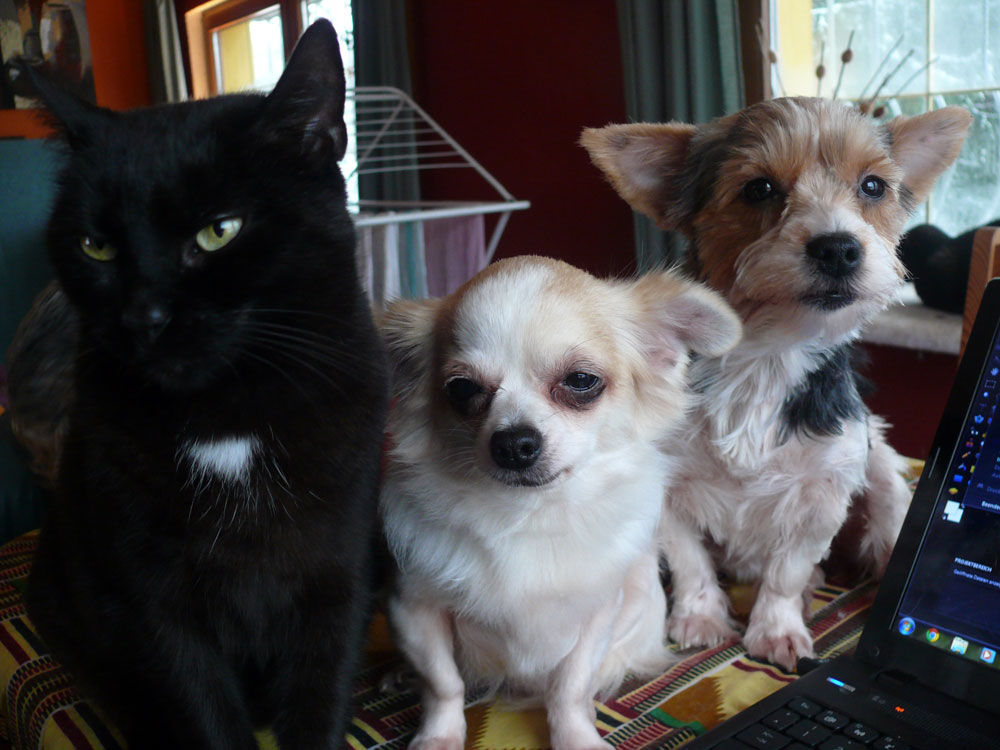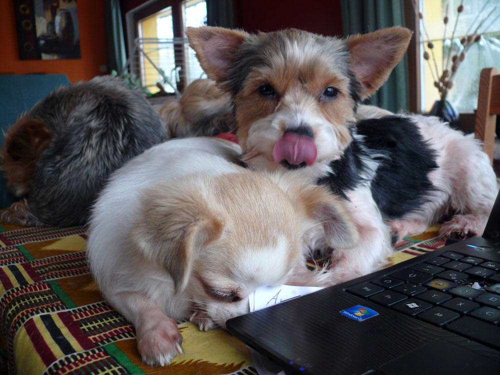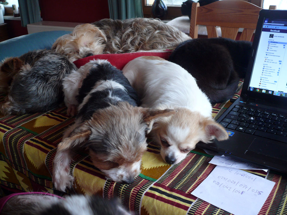 Es ist wahr: in der Hundefamilie gibt es keine Ausnahmen. Was einer darf, dürfen alle. So kann es aber passieren, dass der Arbeitsplatz mit den "kleinen Mädchen" neben dem Laptop - bisher doch so heimelig eingerichtet - plötzlich ein gaaanz klein wenig ... überbelegt ist. Weil: was kleine Mädchen dürfen... (...dürfen auch größere Mädchen oder auch Katzen oder auch...) :-)