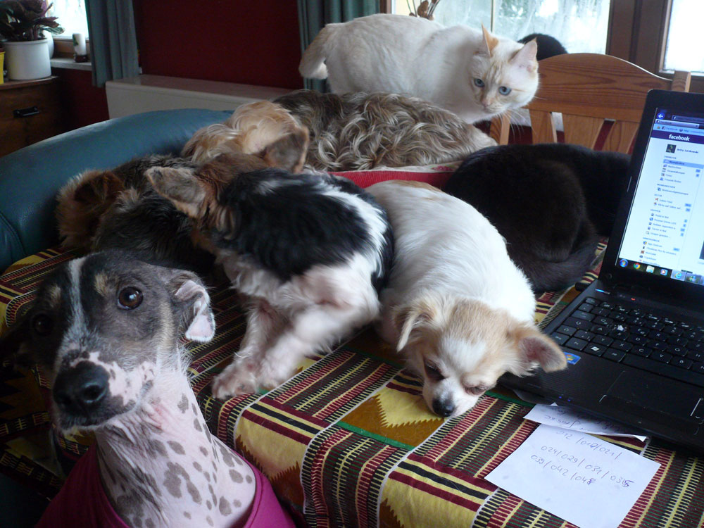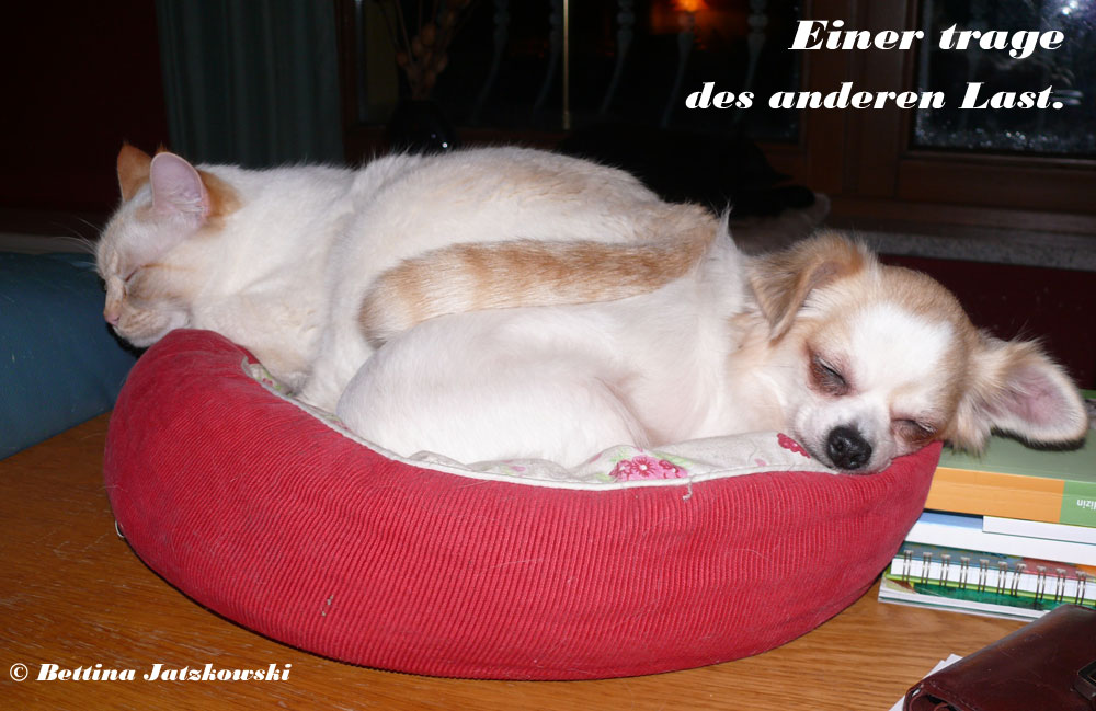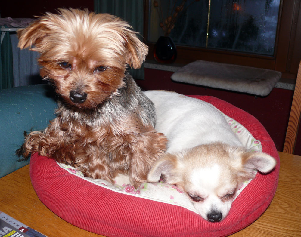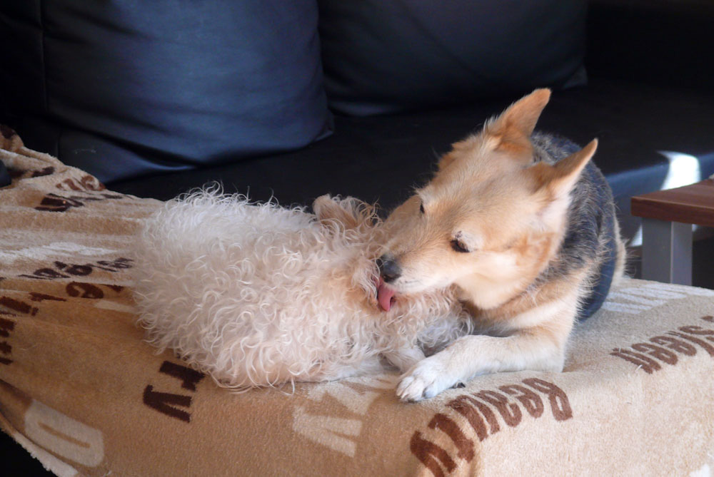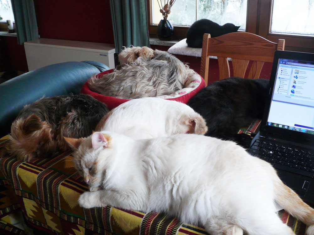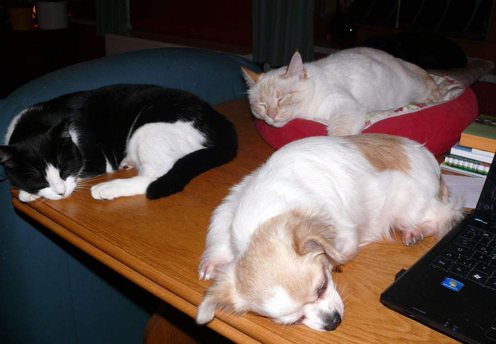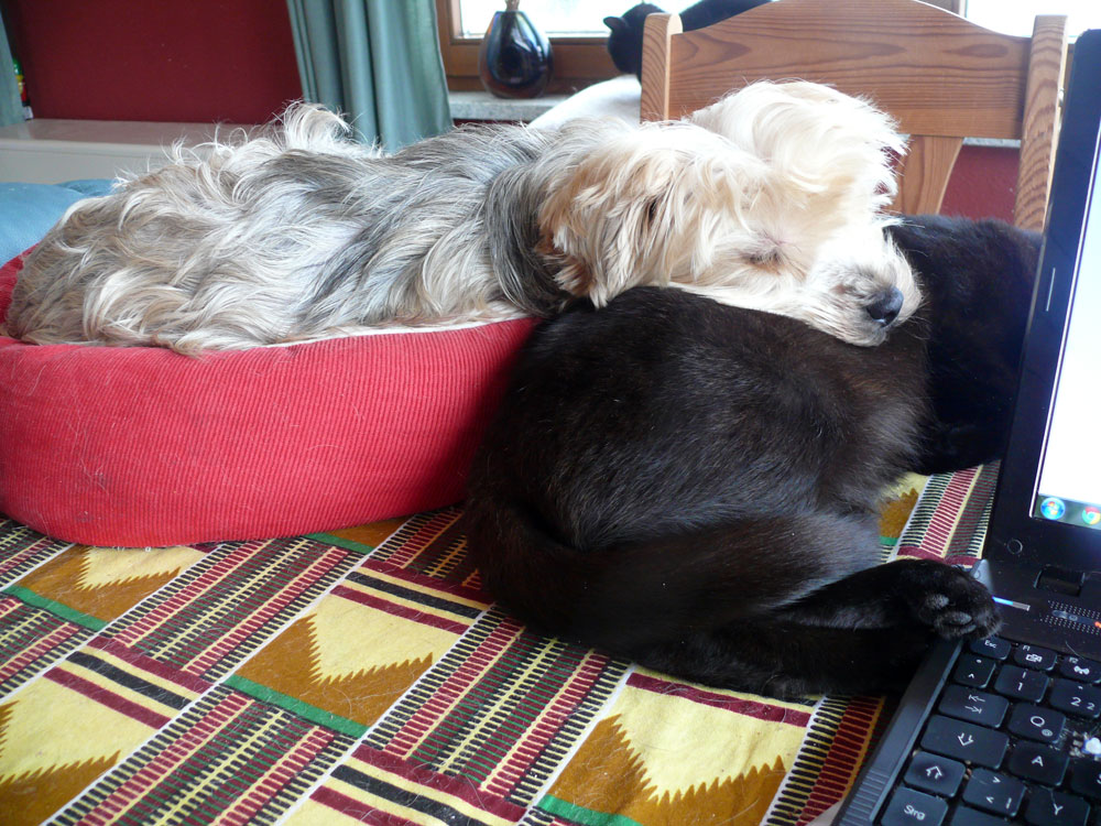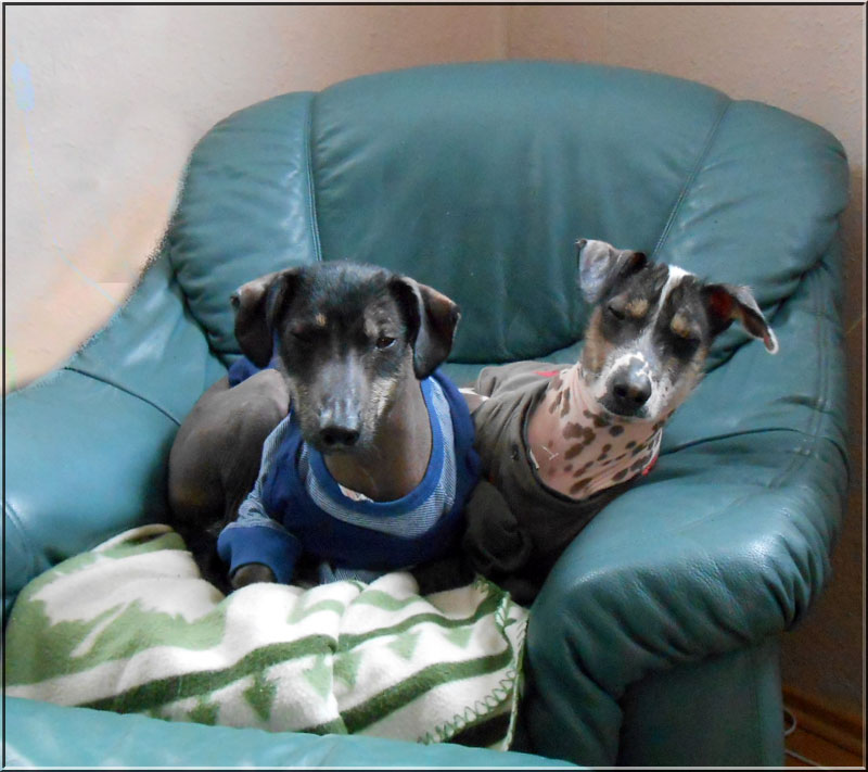 Es ist wahr: in der Hundefamilie gibt es keine Ausnahmen. Was einer darf, dürfen alle. So kann es aber passieren, dass der Arbeitsplatz mit den "kleinen Mädchen" neben dem Laptop - bisher doch so heimelig eingerichtet - plötzlich ein gaaanz klein wenig ... überbelegt ist. Weil: was kleine Mädchen dürfen... (...dürfen auch größere Mädchen oder auch Katzen oder auch...) :-)